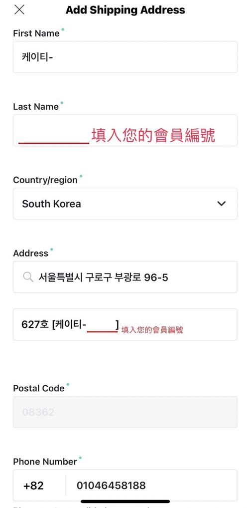 名/Last Name/명:您自己的專屬會員編號四碼